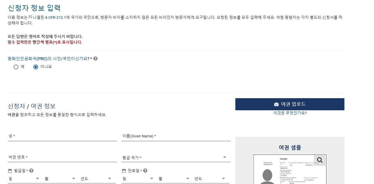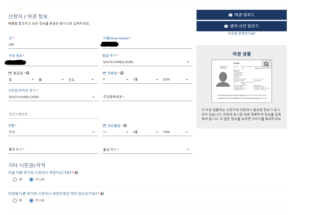 여권정보를 업로드하면 자동으로 몇 개가 적혀요. 여권정보랑 정확하게 있어야 해서 한 번 더 체크해 주세요