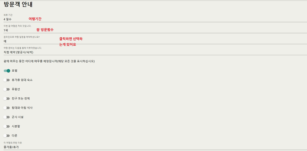 체류기간은 여행일박수를 쓰고 그다음 괌 방문횟수를 고르면되요.