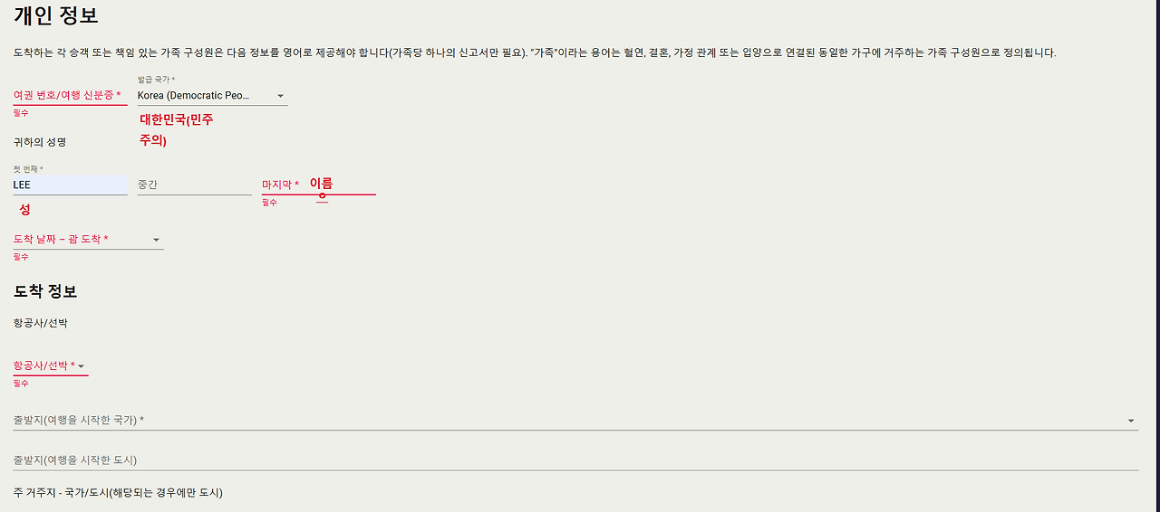 여권번호, KOREA / 첫 이름은 성으로 작성하고 마지막은 한국기준인 이름을 써주시면 되요.